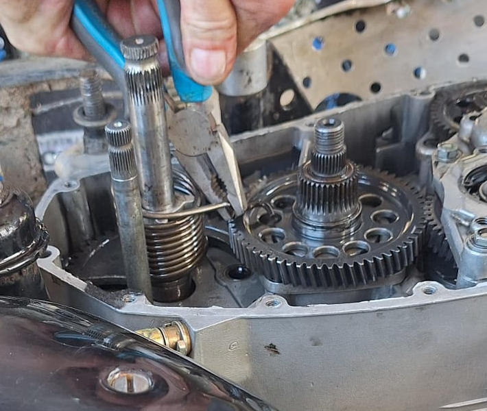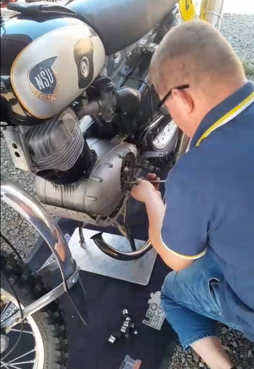 Wenig überraschend war der Sieg von Thomas Sandig auf seiner NSU in der Klasse C2. Aber große Aufregung gab es vor der technischen Abnahme. Thomas wollte gerade zur Maschinenkontrolle fahren und den Motor ankicken, da passierte das Unfassbare. Die Kickstarterwelle wanderte einige cm aus dem Motorgehäusedeckel heraus. Erste Reaktion: "Das war's!" Fieberhaft wurde über mögliche Ursachen diskutiert. Dann begann die Demontage ohne Spezialwerkzeug. Ein Sicherungsring war aus der Nut gesprungen, wodurch die Welle nicht mehr in der richtigen Position blieb. Nach dem Zusammenbau funktionierte alles wieder perfekt. Trotzdem ist eine genaue Durchsicht nochmals ratsam.